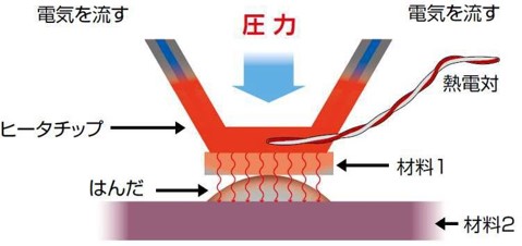 02 Aug 脈衝式熱壓原理 脈衝熱壓焊原理金屬加熱體中流過脈衝電流,產生焦耳熱。利用熱量進行焊接和樹脂鉚接。熱體上連接了熱電偶,用於溫度反饋進行跟蹤已設定的溫度曲線的控制進行脈衝熱壓焊動作原理 1.將接合物安裝在夾具上,進行對位。2.安裝在加壓頭上的加熱電極觸碰接頭部位。3.到達設定加壓後,加熱指令信號進入脈衝加熱電源,用溫度曲線通電加熱。4.通電加熱結束後,保持加壓直至溫度降至設定溫度後保持。5.當溫度下降時,通過來自脈衝熱電源的信號釋放加壓。 脈衝熱壓焊應用
